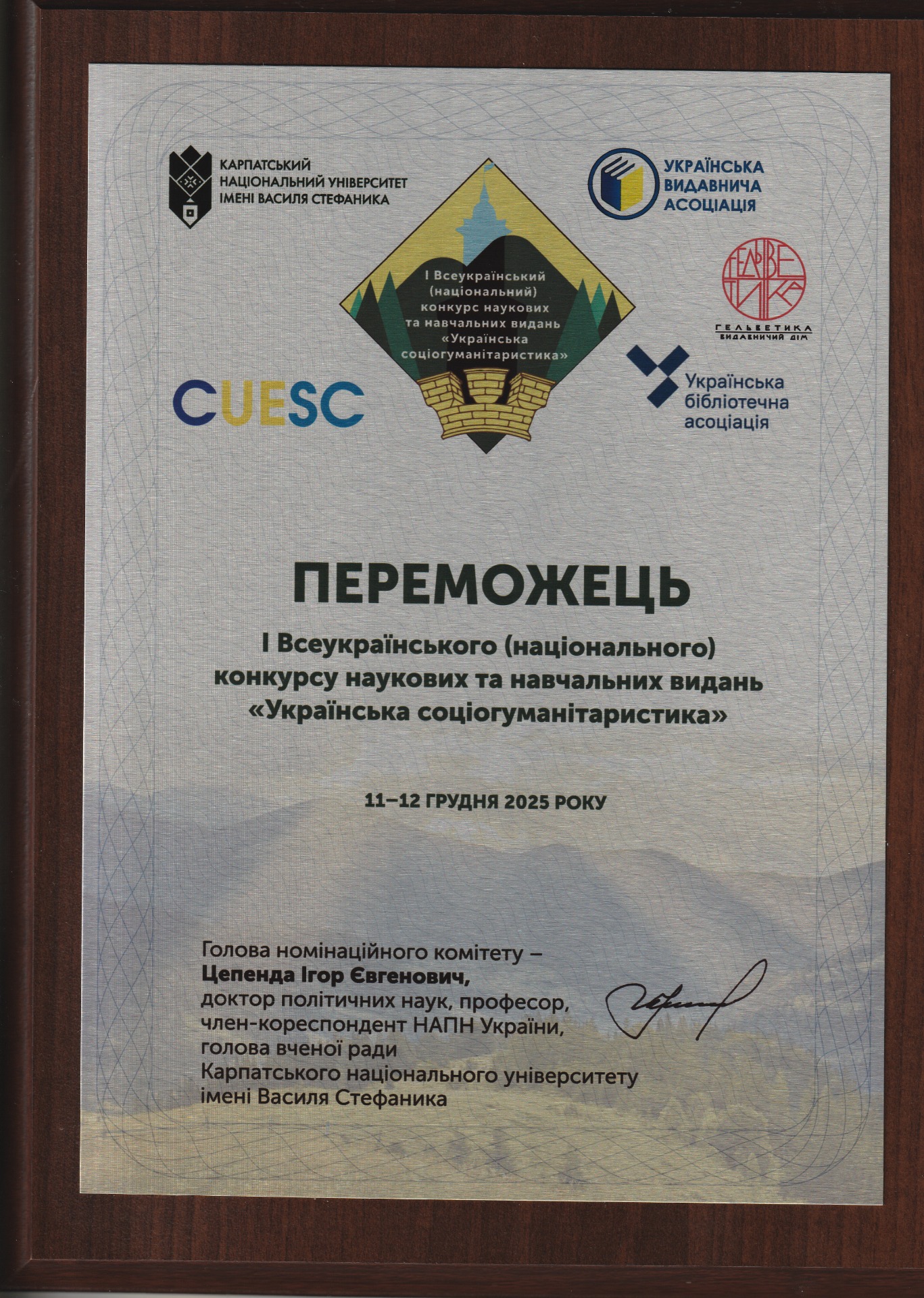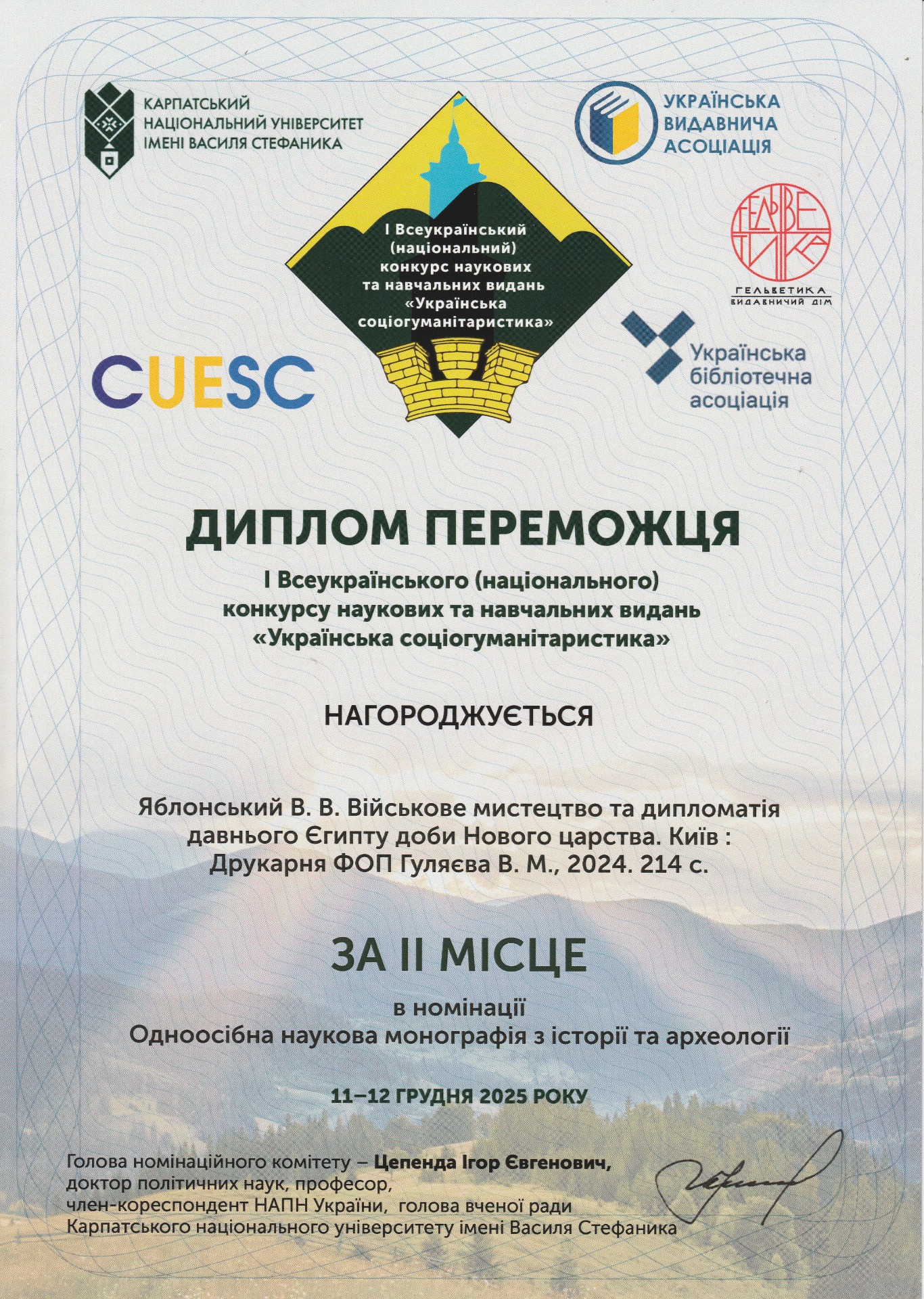 На конкурсі було відзначено монографію «Військове мистецтво та дипломатія давнього Єгипту доби Нового царства» (Київ, 2024), яку з 2024 р. включено до Online Egyptological Bibliography Оксфордського університету.